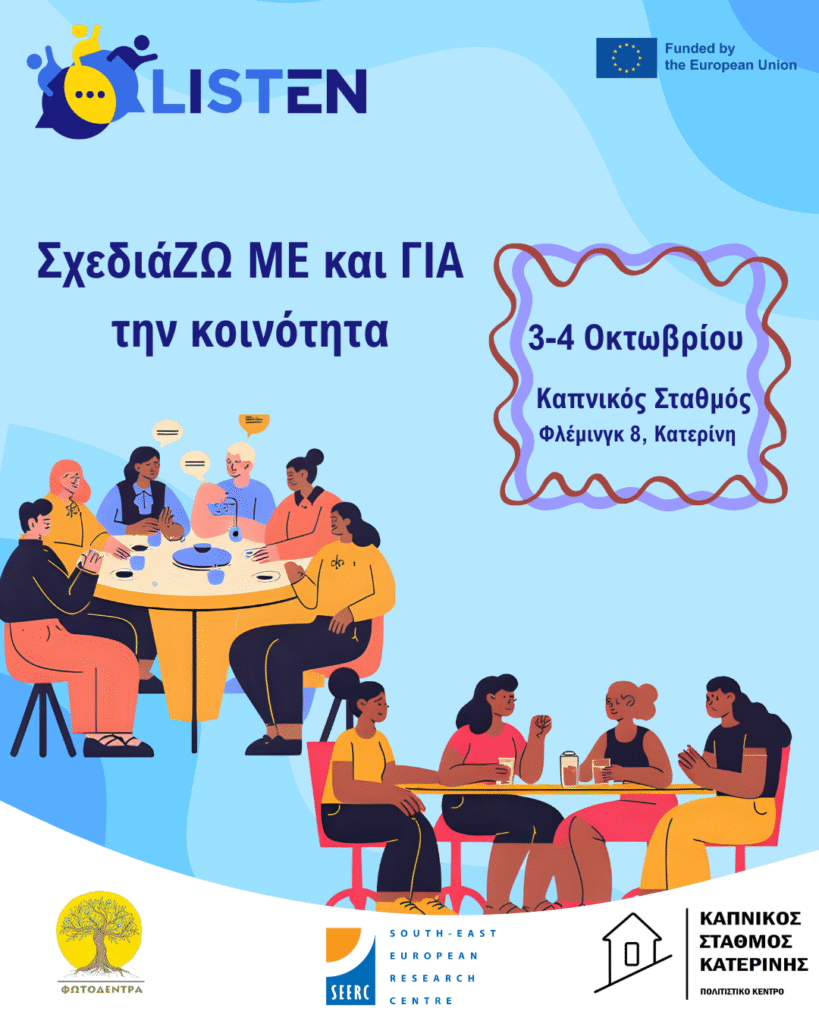 Στις 3–4 Οκτωβρίου, στον Καπνικό Σταθμό (Φλέμινγκ 8, Κατερίνη), το έργο LISTEN – Learning and Inclusion for Sustainable Community Engagement διοργανώνει μία σειρά επιμορφωτικών εργαστηρίων με τίτλο ΣχεδιάΖΩ ΜΕ και ΓΙΑ την κοινότητα. Οι θεματικές ενότητες περιλαμβάνουν τον συμμετοχικό σχεδιασμό, την δικτύωση της κοινωνίας των πολιτών καθώς και τη σύνταξη προτάσεων για ευρωπαϊκή χρηματοδότηση.